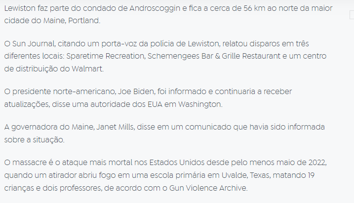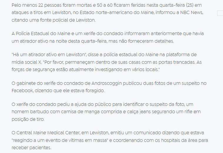 Home / Policial / Atirador mata 22 pessoas em cidade dos Estados UnidosDestaquePolicialAtirador mata 22 pessoas em cidade dos Estados UnidosPor TVMídia Nenhum comentário26 de outubro de 2023 08:31 Share ArticlePrevious ArticleCampeonato Brasileiro: Palmeiras goleia São Paulo por 5 a 0Next ArticleCâmara aprova projeto de lei de taxação para super-ricosTVMídia Related Posts Pagamento dos servidores estaduais começa quinta-feira (26) e inj ... 23 de fevereiro de 2026 Lucas Ribeiro inspeciona obra da Ponte do Futuro, que atinge 50% ... 23 de fevereiro de 2026 Prefeitura de Pirpirituba dá início ao Ano Letivo 2026 com novida ... 23 de fevereiro de 2026 Deixe um Comentário Cancelar respostaO seu endereço de e-mail não será publicado. Campos obrigatórios são marcados com *ComentárioNome * E-mail * Site Salvar meus dados neste navegador para a próxima vez que eu comentar. Δ