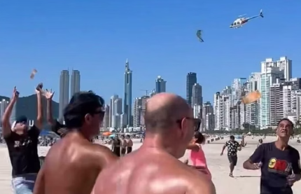 Um helicóptero provocou uma “chuva de dinheiro” na Praia Central de Balneário Camboriú na manhã deste domingo (21/4). Imagens publicadas nas redes sociais mostram a aeronave em voo baixo sobre a faixa de areia e banhistas correndo para pegar as notas.