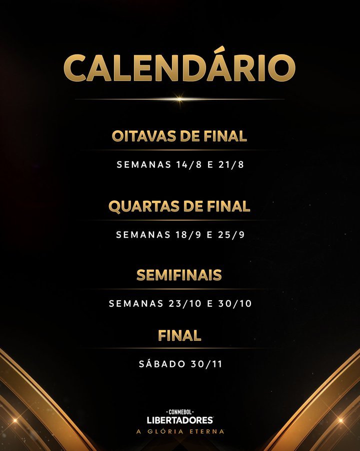 As partidas das oitavas de final da Copa Libertadores serão disputados nas semanas dos dias 14 e 21 de agosto. As quartas de final serão realizadas nas semanas de 18 e 25 de setembro. As semifinais estão programadas para as semanas dos dias 23 e 30 de outubro. E a grande decisão está marcada para o dia 30 de novembro, em Buenos Aires (Argentina).