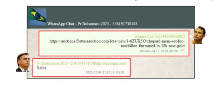 O relatório cita que, cerca de um minuto depois, Bolsonaro responde “Selva” a Mauro Cid, que seria uma sinalização de ciência do leilão. Os dados foram extraídos de um celular de Bolsonaro apreendido durante as investigações.