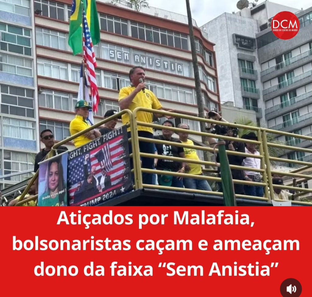 Para piorar a situação, essa imagem histórica em que num popular comocou uma faixa com a frase: “Sem Anistia”, no alto do prédio onde montaram o palco golpista e agora o Diário do Centro do Mundo (DCM), denunciou que estão perseguindo o autor da faixa.