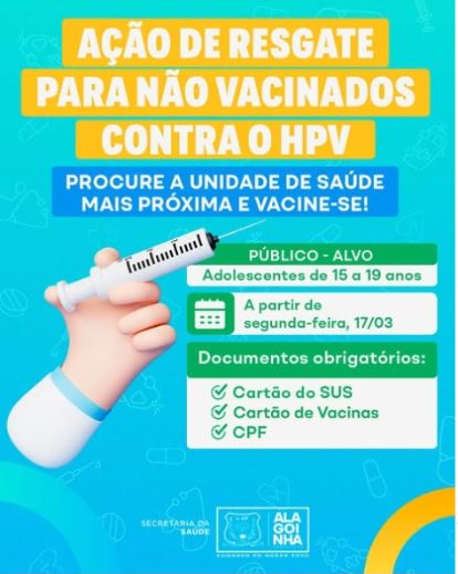A prefeitura de Alagoinha, por meio da Secretaria Municipal de Saúde, iniciou nesta segunda-feira (17) uma ação de resgate para imunizar adolescentes de 15 a 19 anos que ainda não receberam a vacina contra o HPV. A iniciativa tem como objetivo ampliar a cobertura vacinal e garantir a proteção dos jovens contra o vírus, que pode causar diversos tipos de câncer, como o de colo do útero, pênis, ânus e orofaringe.