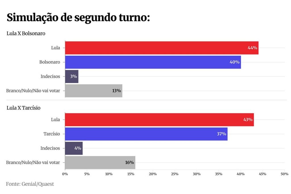 Quando o confronto é entre Lula e o governador de São Paulo, a diferença aumenta. O atual presidente teria 44% das intenções, e Tarcísio 37%. O percentual de votos indecisos é de 4% e branco/nulo/não vai votar somam 16%.