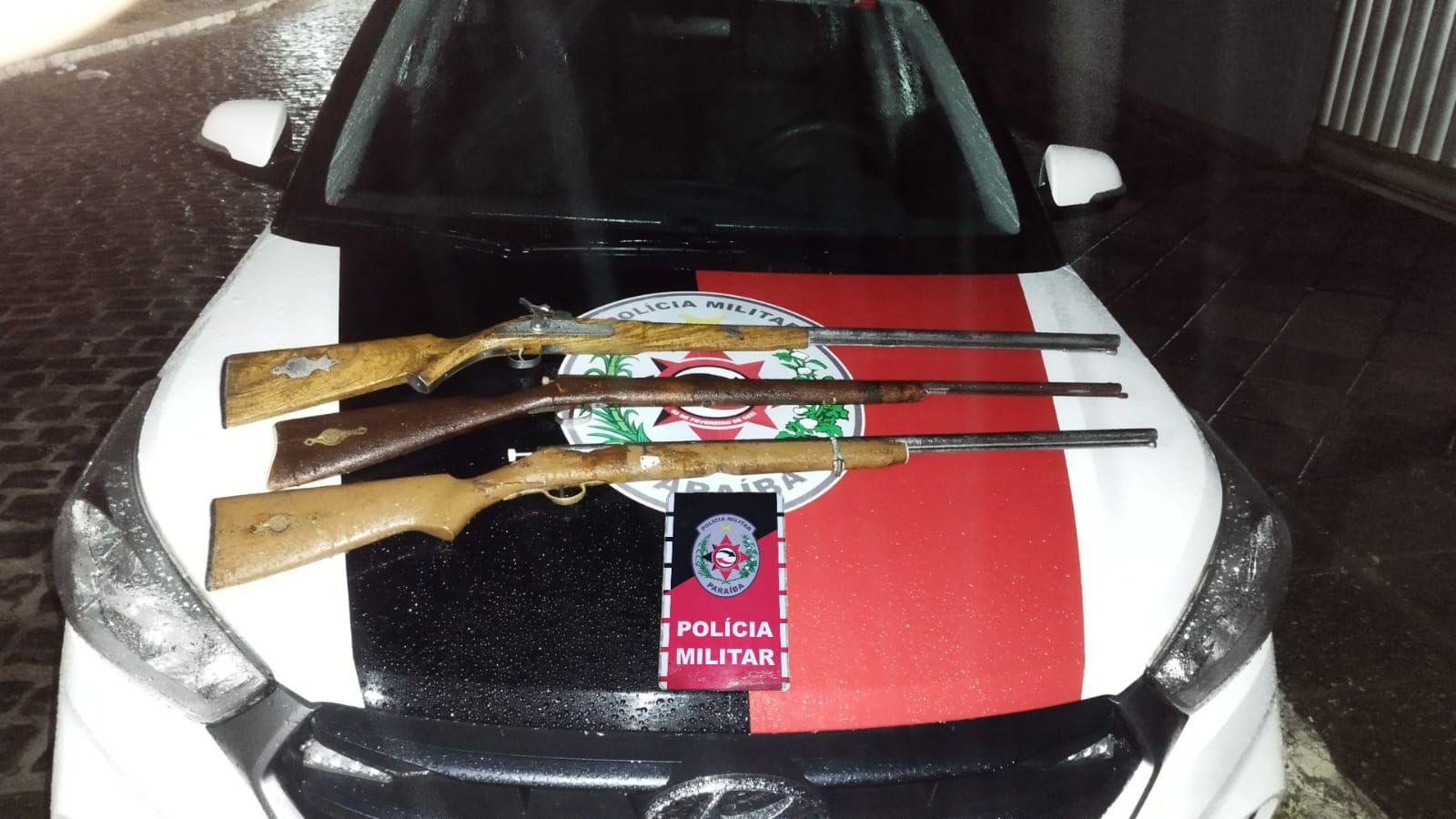 Durante buscas no interior da residência, foram localizadas três armas de fogo de fabricação artesanal, de calibre não identificado, as quais, segundo informações colhidas no local, pertencem ao acusado. As armas foram apreendidas e apresentadas na Delegacia de Polícia Civil para os procedimentos cabíveis.