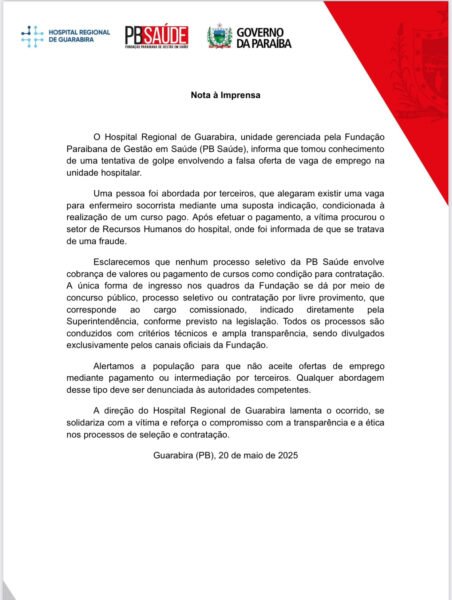 Uma pessoa caiu um golpe da falsa promessa de emprego no Hospital Regional de Guarabira. A informação foi repassada através de uma nota à imprensa. A direção do HRG temendo que outras pessoas caiam no golpe, está fazendo um alerta a todos.