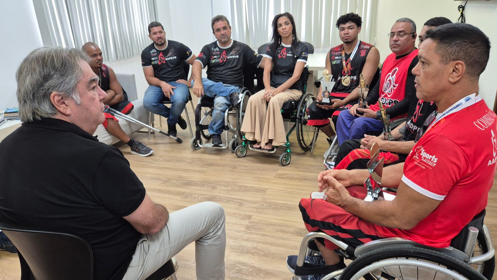 Os integrantes da Associação Atlética da Pessoa com Deficiência da Paraíba (AAPD-PB) foram recebidos, nesta sexta-feira (23) pelo secretário de Estado da Juventude, Esporte e Lazer (Sejel), Lindolfo Pires, na Vila Olímpica Parahyba. Na oportunidade, eles apresentaram ao gestor o troféu de campeão brasileiro sub-23 e agradeceram o apoio que o Governo da Paraíba vem concedendo ao paradesporto.