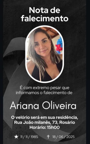 É com profundo pesar que noticiamos o falecimento de Ariana Oliveira, 39 anos. Sua luta foi árdua contra o câncer. Ela trabalhou durante alguns anos no Hospital Regional de Guarabira e teve que se afastar para cuidar da saúde.
