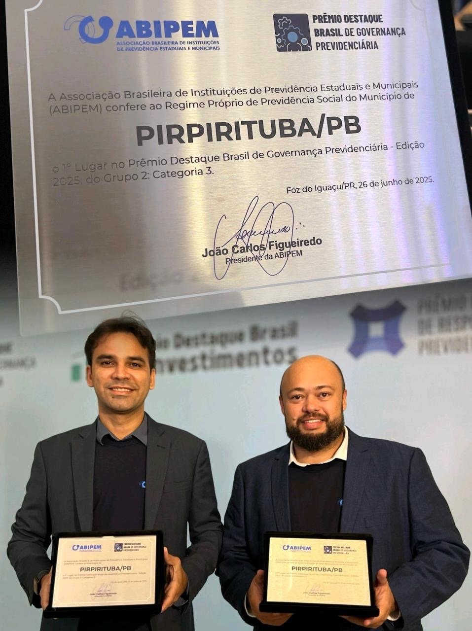 O prefeito Danilo Rocha e o gestor do Instituto da Previdência de Pirpirituba, Manoel Neto, já se encontram em Foz do Iguaçu para o recebimento dos prêmios concedidos. A Associação Brasileira de Instituições de Previdência Estaduais e Municipais (ABIPEM) premiou o município de Pirpirituba em três categorias através da portaria 015/2025, Destaque Brasil de Governança Previdenciária – 1° Lugar, portaria 014/2025, Destaque Brasil de Responsabilidade Previdenciária – 12° lugar e portaria 013/2025, Destaque Brasil de Investimentos – 7° Lugar. É o segundo ano consecutivo que o município do brejo paraibano é destaque nos prêmios ABIPEM.