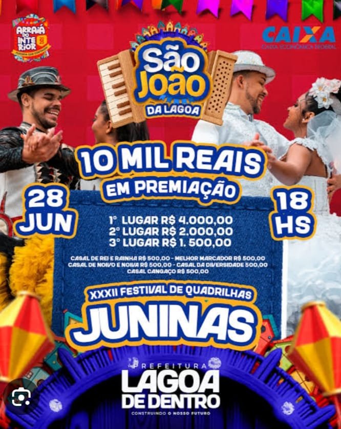 Com uma premiação de mais de R$ 10.000,00, acontece neste sábado, 28, o XXXII Festival de Quadrilhas Juninas da cidade de Lagoa de Dentro, um dos mais antigos da Paraíba.