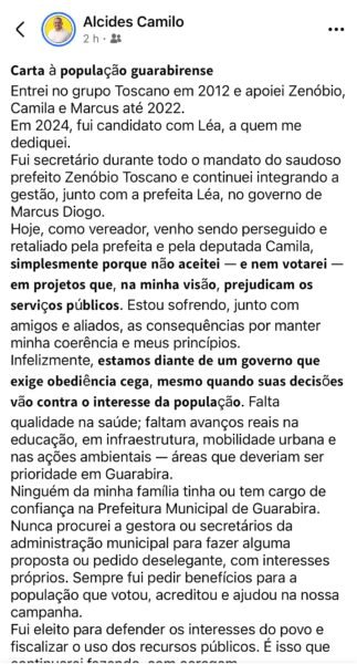 Basicamente os parlamentares alegam as mesmas questões. Segundo eles, mãe e filha exigem obediência cega de todos que fazem parte do grupo. Não importa se os projetos enviados à câmara sejam prejudiciais à população, todos tem que votar como Léa e Camila mandam. Nas cartas, os parlamentares dizem o que a população cobra há anos, afinal de contas são 12 anos que o grupo toscano está no poder em Guarabira, e serviços básicos como: saúde, educação, infraestrutura, mobilidade e limpeza urbana são negligenciados diariamente. Tudo está precário.