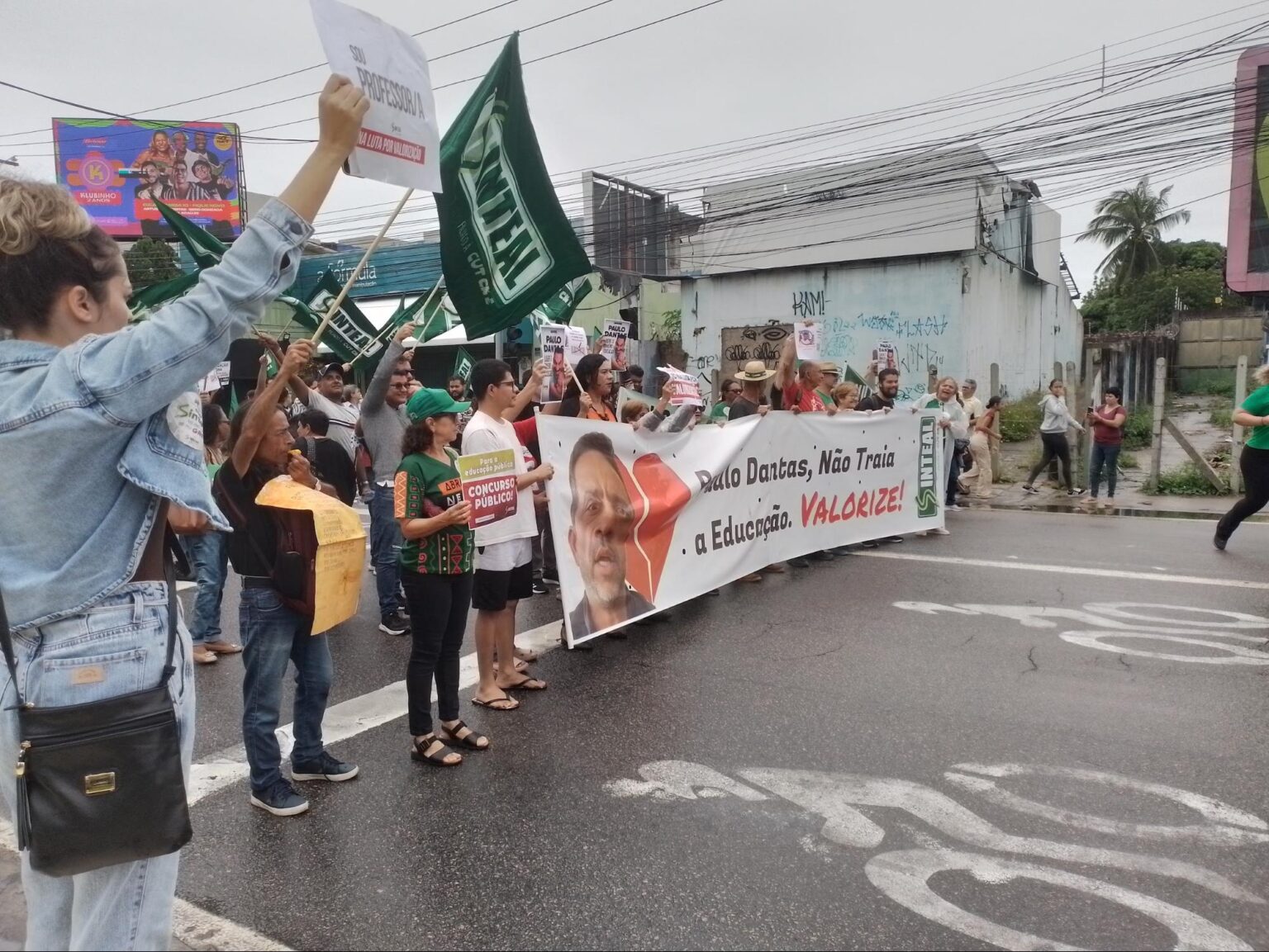Na manhã de terça-feira, dia 5, dezenas de educadores promoveram um protesto simbólico na Praça Centenário, em Maceió. O ato percorreu a Avenida Fernandes Lima até a Praça dos Martírios, sede do governo estadual. Cartazes com mensagens como “Paulo Dantas, valorize a educação” e “Educação em greve” denunciaram o descaso com os compromissos assumidos pelo governador do estado, Paulo Dantas (MDB) .