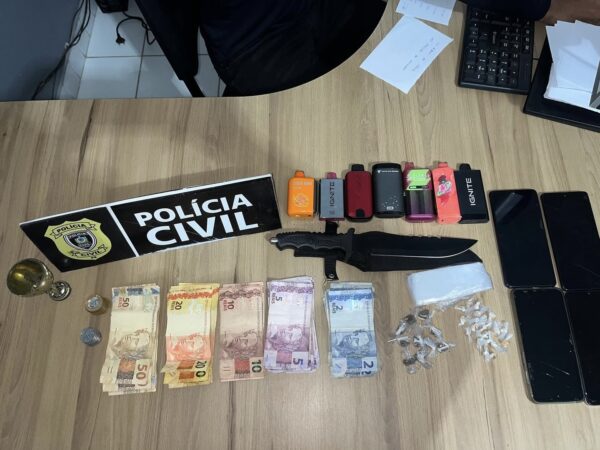 Durante o cumprimento do mandado, os policiais apreenderam dezenas de porções de substâncias semelhantes ao crack e à maconha, além de mais de R$ 1.000,00 em espécie — em dinheiro fracionado, típico da atividade de tráfico —, e sacolas plásticas utilizadas para acondicionamento de entorpecentes. No mesmo local, foram resgatadas cinco aves silvestres mantidas em cativeiro, configurando crime ambiental, e apreendidos ainda três aparelhos celulares e cigarros eletrônicos (vape).