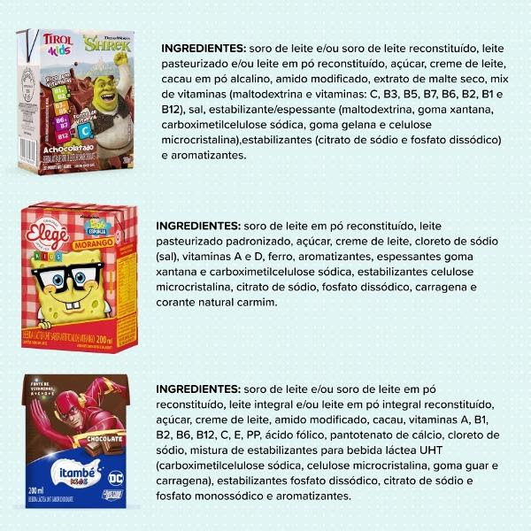 Na pesquisa de rótulos para esta edição, encontrei bebidas com mais aditivos do que ingredientes. Estabilizantes, corantes, reguladores de acidez, aromatizantes e espessantes estão dentro das caixinhas que também levam um mix de vitaminas e minerais sintéticos, numa tentativa de parecerem saudáveis. Mas acrescentar esses nutrientes numa bebida açucarada não faz dela melhor. Além do mais, uma alimentação rica em vegetais variados e boas fontes de proteínas já fornece todos os nutrientes de que uma criança precisa.