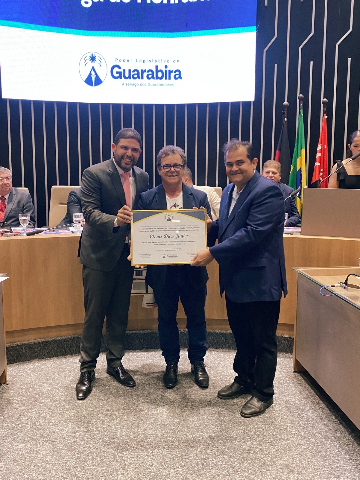 O artista plástico Clóvis Dias Júnior também foi homenageado com a Comenda de Mérito Cultural Poeta Geraldo Alverga Cabral, em reconhecimento à sua contribuição para as artes plásticas e para a cultura guarabirense. “Ao conceder esta Comenda, Guarabira presta um justo tributo ao seu filho ilustre, cuja arte ultrapassa fronteiras e projeta o nome da cidade no cenário cultural da Paraíba e do Brasil”, afirmou Renato Meireles.