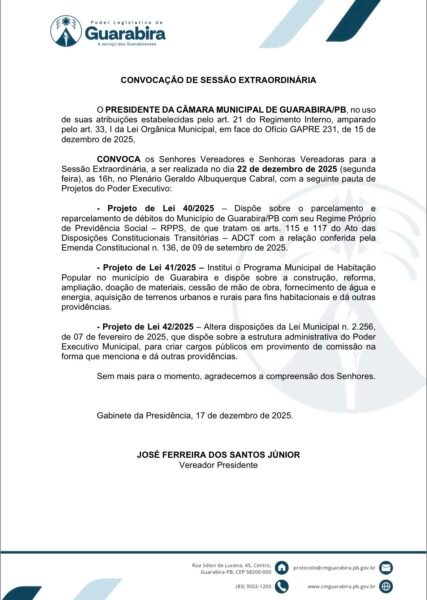 A Câmara Municipal de Guarabira realizará, na próxima segunda-feira, dia 22, às 16h, uma Sessão Extraordinária no plenário da Casa Legislativa. A convocação é feita pelo presidente da Câmara, Júnior Ferreira (União Brasil), conforme as atribuições previstas no art. 21 do Regimento Interno, com amparo no art. 33, inciso I, da Lei Orgânica Municipal, em atendimento ao Ofício GAPRE nº 231, de 15 de dezembro de 2025.