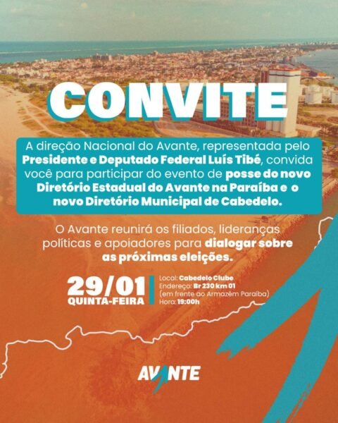 A posse do novo Diretório Estadual do Avante na Paraíba e do Diretório Municipal de Cabedelo será oficializada em evento convocado pela Direção Nacional do partido. O convite foi assinado pelo presidente nacional do Avante e deputado federal, Luís Tibé, e é direcionado a filiados, lideranças políticas e apoiadores.