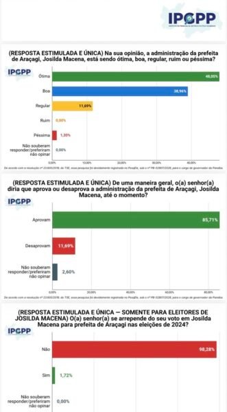 Em recente pesquisa realizada no município de Araçagi, pelo Instituto de Pesquisa de Gestão e Política Paraibano, sobre a gestão da prefeita Josilda Macena, os dados mostram índices altíssimos de aprovação popular.