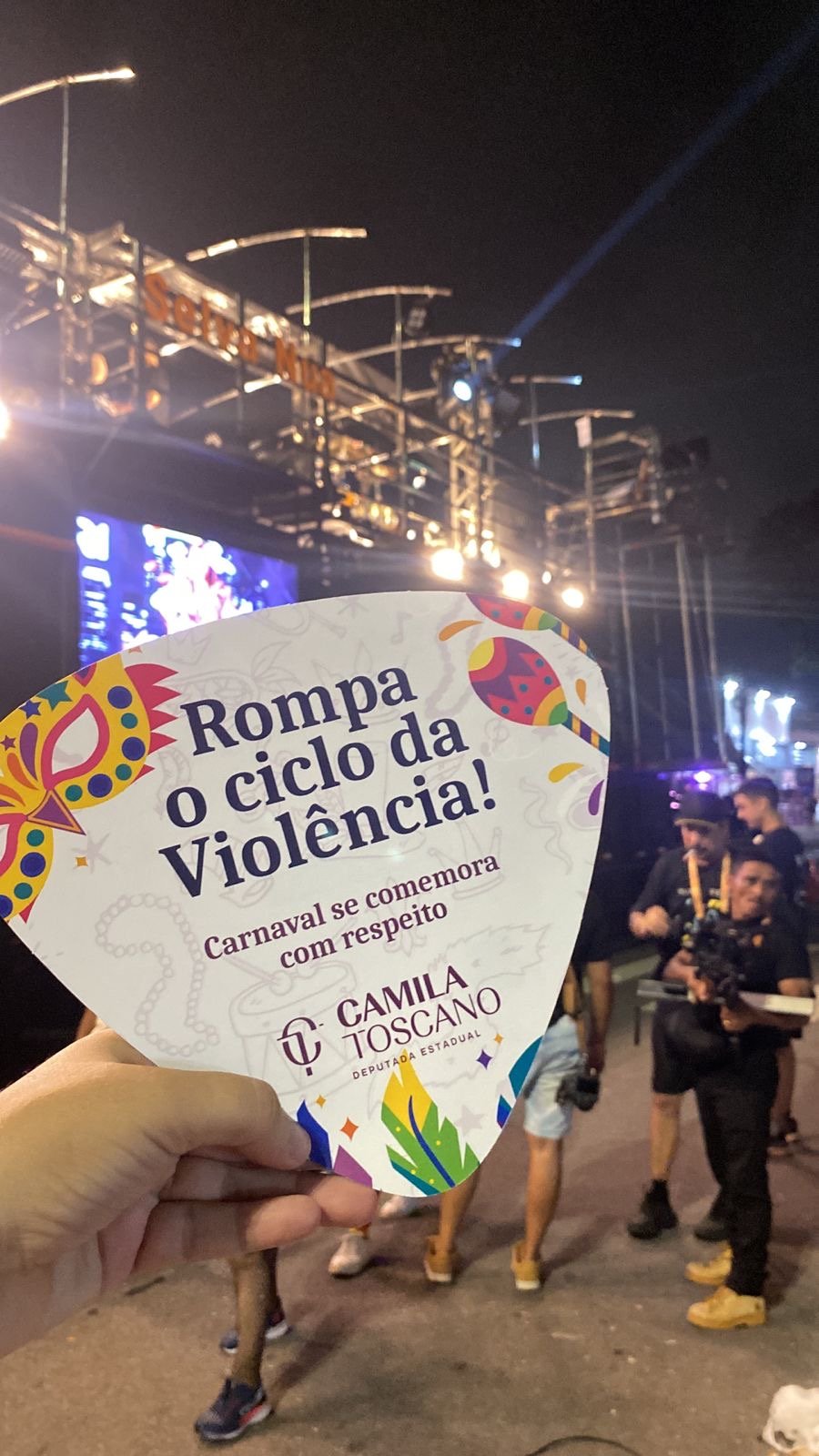 Durante o Muriçocas do Miramar, considerado o maior bloco de arrasto pré-carnavalesco do mundo, em João Pessoa, a deputada estadual Camila Toscano (PSDB) realizou nesta quarta-feira (11) uma ação educativa de enfrentamento à violência contra a mulher. A iniciativa distribuiu leques temáticos com orientações sobre os tipos de violência e informações sobre onde e como denunciar.