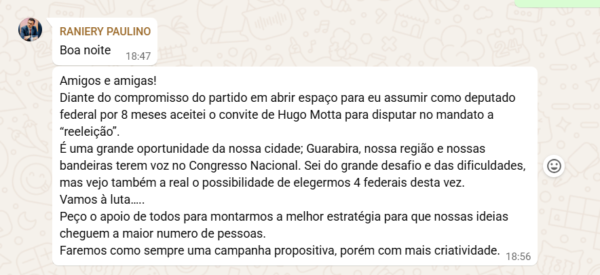 Em comunicado feito em um grupo de WhatsApp fechado, Raniery Paulino disse ter aceitado o convite do presidente estadual do Republicanos, Hugo Motta, para a disputa da eleição de deputado federal.