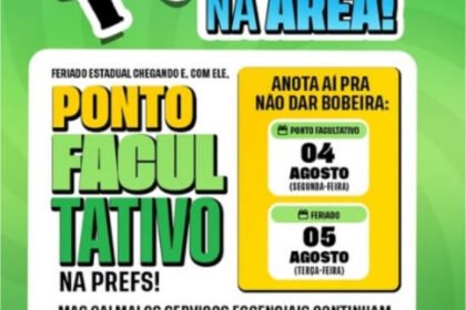 Prefeitura de Alagoinha informa à população que a próxima segunda-feira, dia 04 de agosto, será ponto facultativo nas repartições públicas municipais. Já na terça-feira, 05 de agosto, será observado o...